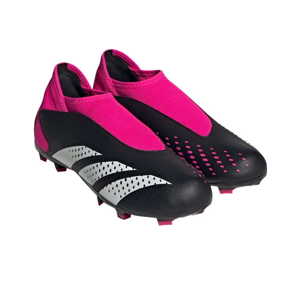 - Las botas de fútbol infantil adidas Predator Accuracy.3 Laceless FG negro rosa están confeccionadas con material sintético con textura y tecnología High Definition Texture para mejorar en golpeo y grip con el balón. Diseño con collar textil elástico y talón de mayor estabilidad en cada movimiento.
