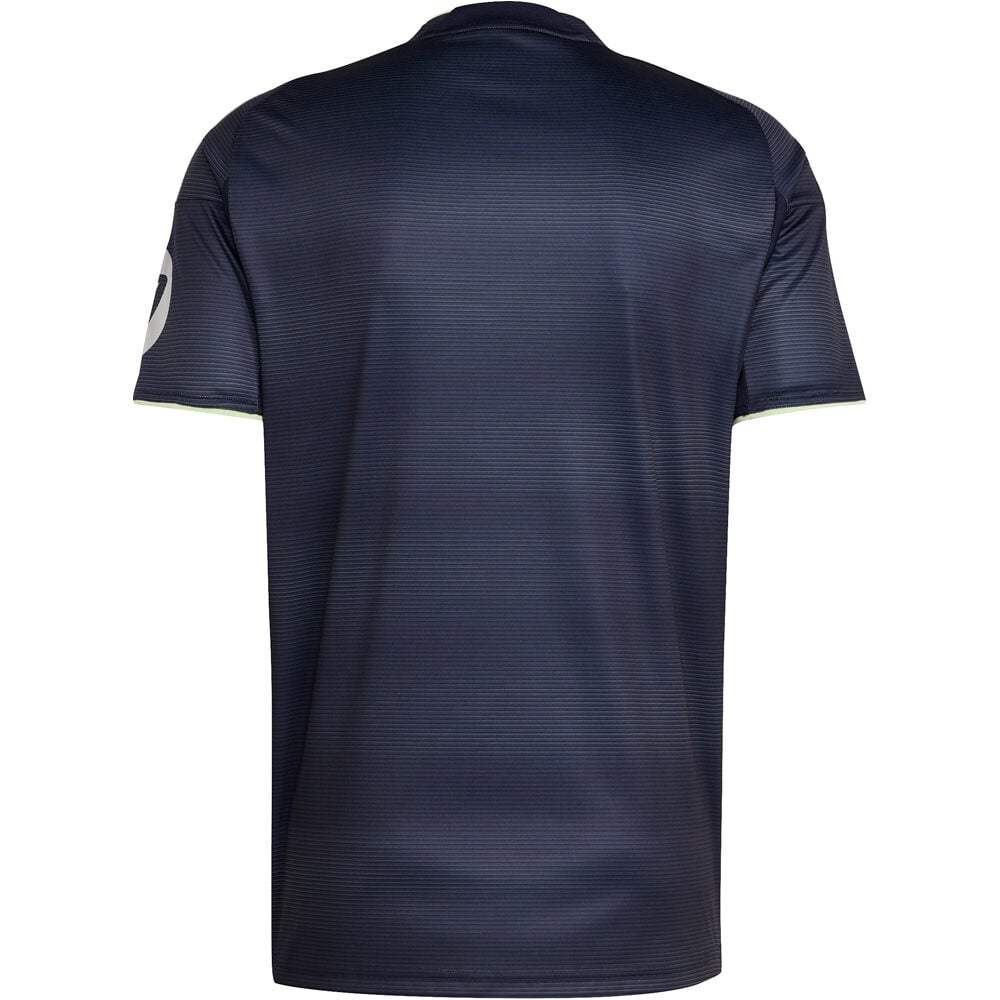 - Camiseta fútbol oficial adidas REAL MADRID 25/26 segunda equipación para la temporada 2025-2026. Esta camiseta rinde homenaje a las noches mágicas del Santiago Bernabéu, capturando la esencia de los partidos bajo los focos en el templo blanco. Con un elegante tono azul oscuro que evoca el cielo nocturno, esta prenda incorpora detalles plateados metalizados inspirados en la fachada renovada del estadio, así como ribetes verdes que simbolizan el césped del campo. Es una combinación visualmente impactante que une tradición, modernidad y pasión por el fútbol. Diseñada con la tecnología adidas AEROREADY, esta camiseta está pensada para mantener la piel seca y fresca durante el juego o el uso diario. Su tejido técnico de alto rendimiento, junto con un corte cómodo y deportivo, la convierte en una opción ideal tanto para los aficionados más jóvenes como para quienes buscan una prenda funcional y con estilo. Además, está confeccionada con materiales reciclados, en línea con el compromiso de adidas con la sostenibilidad.