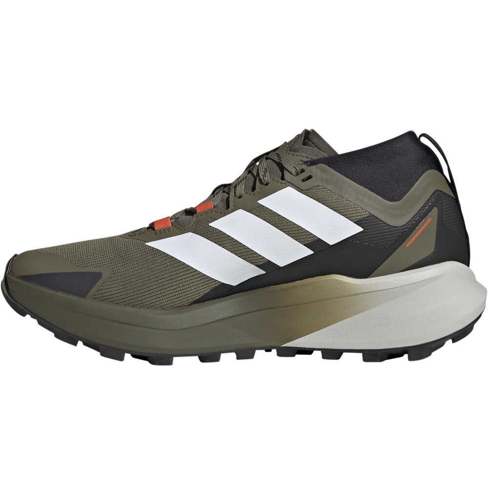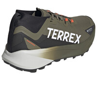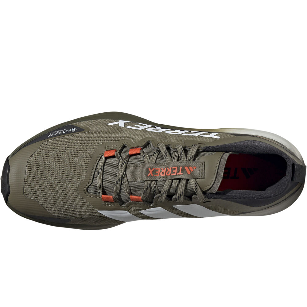 - El upper de las zapatillas trail running adidas TERREX AGRAVIC GTX Verde Oliva Naranja cuenta con una malla técnica ligera y transpirable, reforzada con la membrana GORE-TEX® Invisible Fit impermeable para enfrentarte a los días de mal tiempo, garantizando protección sin sacrificar rendimiento. Las superposiciones de refuerzo termoselladas en el contorno y puntera protegen los dedos de los pies y aumentan la seguridad. El diseño abotinado con lengüeta reforzada y ligera polaina elástica, se adapta al contorno y evita la entrada de piedras.