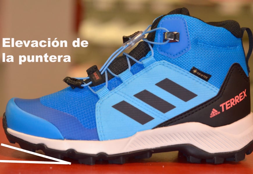 Apoyado el calzado en una superficie plana, es el ángulo con el que la parte anterior de la zapatilla o bota se despega hacia arriba.