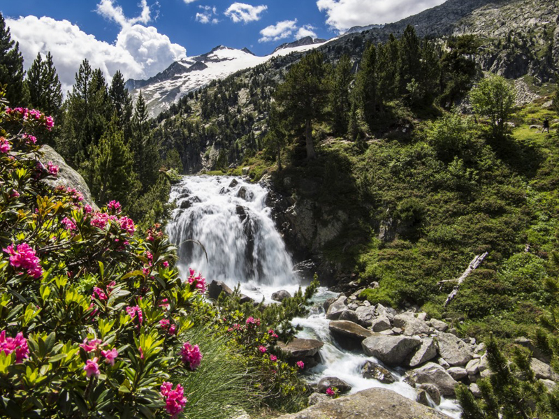 Las cascadas, los bosques y el glaciar colgado en la cara norte del Aneto, a tres mil metros de altitud, son un escenario soberbio al pie de las grandes montañas pirenaicas.