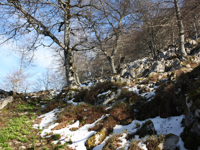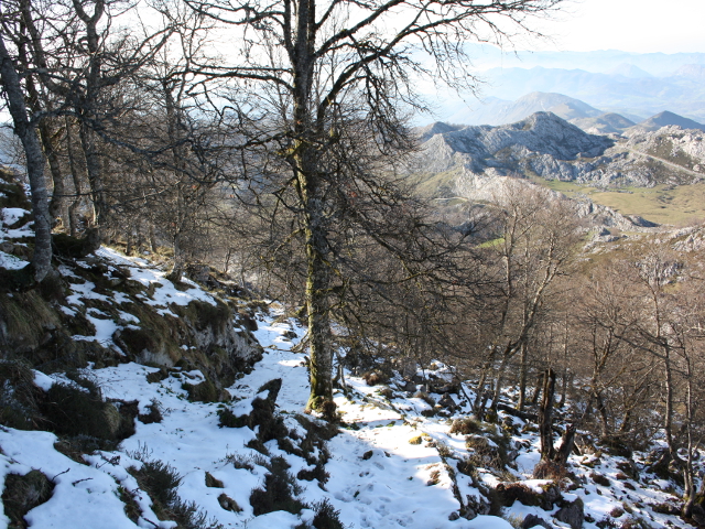 El camino entra pronto en un precioso hayedo, rodeando la peña hacia el oeste y ganando altura, precioso tramo desde el que las vistas que se nos abren hacia el este y norte son realmente extraordinarias. Abajo, a la derecha, veremos la carretera que desciende hacia Covadonga y que nos servirá de referencia.