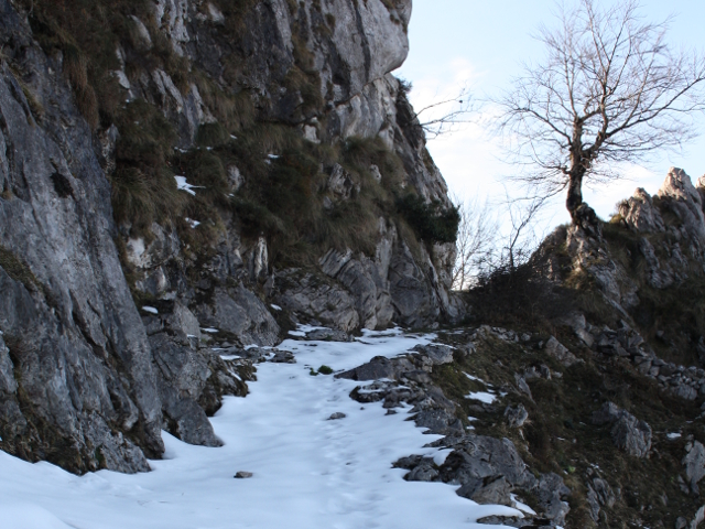 Enseguida termina la campera donde veremos un marcado y espectacular sendero pastoril tallado en la roca y armado con muros de piedra que, encajonado, sube ganando altura por la ladera de la Porra de Enol en su cara noreste, por el que ascenderemos en zigzag salvando un pronunciado desnivel.