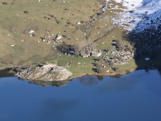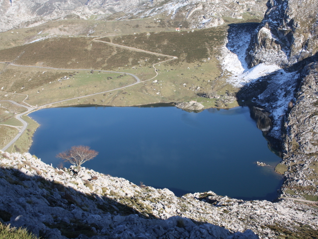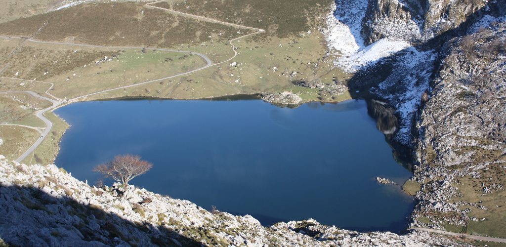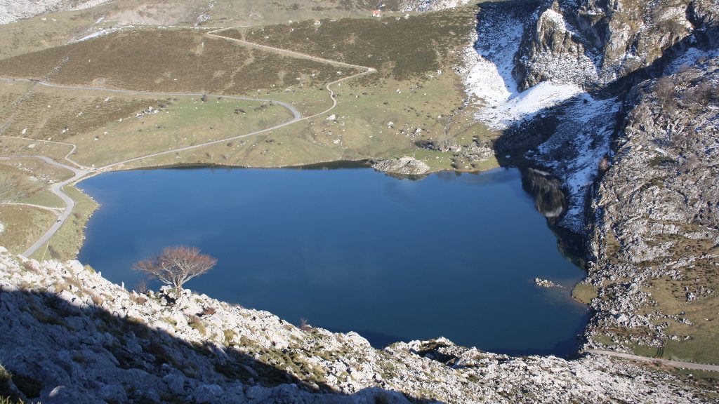 Bajo nuestros pies y rodeado de majadas pastoriles, el lago Enol, el segundo mayor de Asturias y quien se alimenta de las aguas procedentes de las nieves que se acumulan en zonas más altas. Situado en un valle glaciar a 1072 metros de altitud, de forma redondeada, tiene una superficie de unas 11 hectáreas, 515 metros de diámetro y una profundidad máxima de 25 metros.