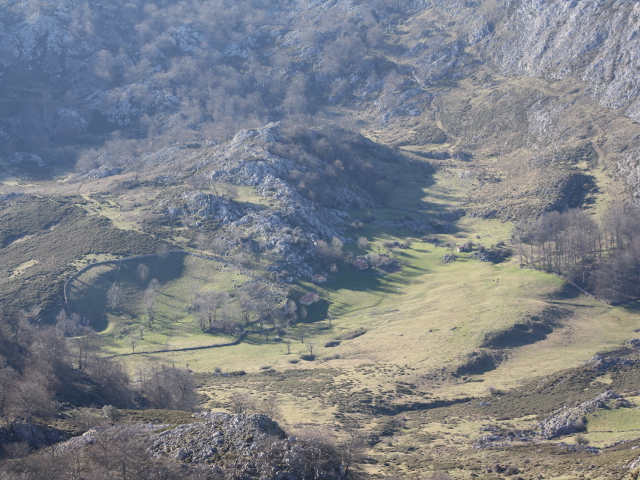 El camino-pista asciende ahora bajo la Porra de Enol, salvando un fuerte desnivel, hasta el collado de Les Veleres y dejando abajo a la derecha, junto al lago, la majada de Los Acebos con sus bonitas cabañas entre arbolado.