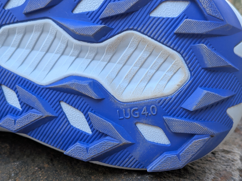 Lo primero que llama la atención al ver la suela es la disposición de sus tacos de 4 mm. No solo están orientados en sentidos opuestos entre la parte delantera (para traccionar en subida) y la trasera (para retener en bajada), sino que en el propio antepié los tacos de un lado y de otro están enfrentados.