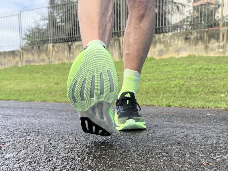 En el antepié hay 5 vaciados longitudinales de este adiwear para reducir peso sin perder propiedades y multitud de ranuras en sentido transversal. El objetivo es que la transición sea fluida sin desarmarse ni perder estructura.