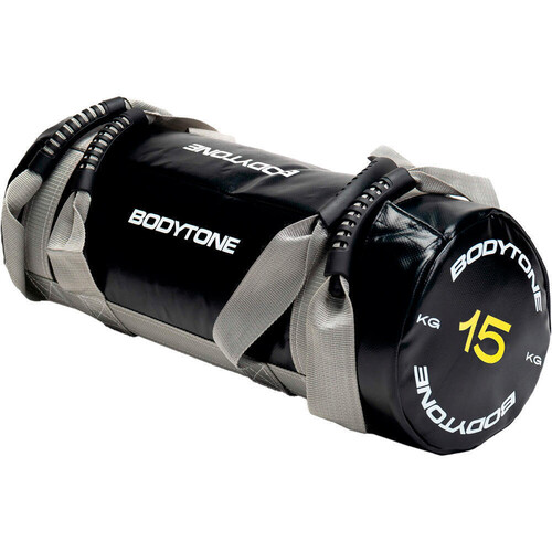 - La bolsa de peso Bodytone Power Bag de 15 kg tiene las siguientes características: Peso neto: 15 kg. Dimensiones: 56 x 23 x 23 cm. Material exterior: PVC. Material interior: Sacos de arena extraíbles. Revestimiento interno: Tejido Oxford de alta resistencia. 4 asas de nylon para agarres múltiples. Uso recomendado: Entrenamiento funcional, fuerza, coordinación, resistencia