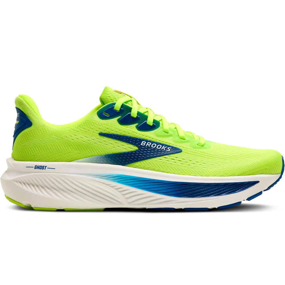 - El corte superior de las zapatillas running Brooks Ghost 17 Lima Azul, está fabricado en tejido técnico Engineered Air Mesh que le confieren un ajuste tipo guante y mejora la adaptación confortable al pie, nada más ponerlas. El estampado 3D Fit del logo y en el contrafuerte le aportan estructura. El nuevo perfil de talón extendido con revestimiento acolchado fija suavemente y reduce las fricciones. Realizado con un 59% de materiales reciclados. Este producto cuenta con el certificado de producto CarbonNeutral®.