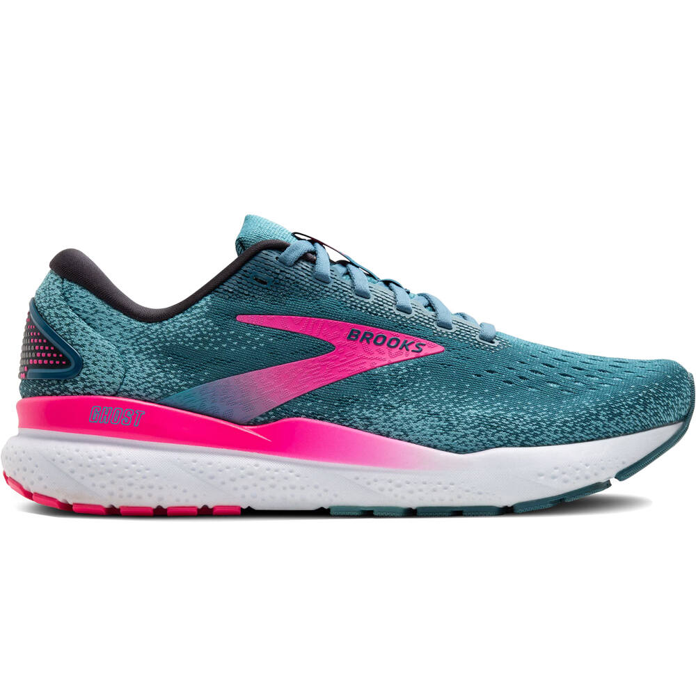 - La parte superior de las zapatillas de running Brooks Ghost 16 Negro Gris Rosa está fabricado en tejido Engineered Air Mesh de ajuste suave y elástico que incrementa las sensaciones de alto confort. El estampado 3D Fit mantiene la estructura. El talón Heel Counter envolvente y acolchado ofrece estabilidad y reduce las molestias. Realizado con un 67.3 % de materiales reciclados.
