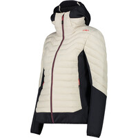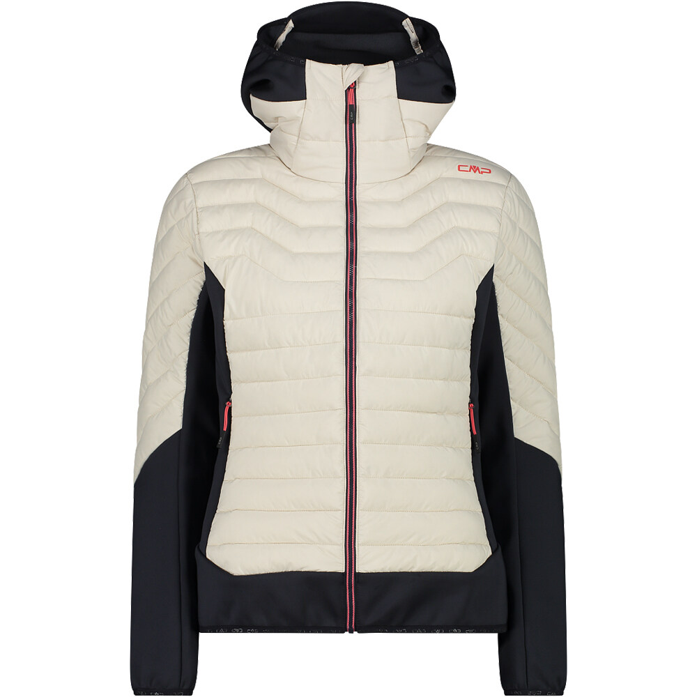 - Este chaqueta híbrida para mujer CMP 34Z2486 cuenta con características esenciales como capucha fija integrada, puños, bajo y capucha con elásticos, y prácticos bolsillos laterales con cremallera.
