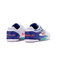 - La parte superior de estas zapatillas fútbol sala Joma Top Flex JR IN Blanco Azul Verde está realizada en piel sintética con sistema VTS transpirable, y microfibra ligera con costuras que soportan la dilatación para ajustarse al pie. Zona del tobillo y lengüeta de tejido transpirable y cómodo.