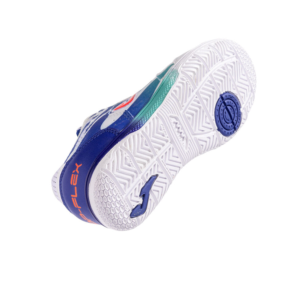 - La suela de las zapatillas de fútbol sala Joma Top Flex JR IN compuesta de caucho DURABILITY de tracción resistente, con diseño de líneas FLEXO y punto ROTATION de giro que facilitan los movimientos multidireccionales.