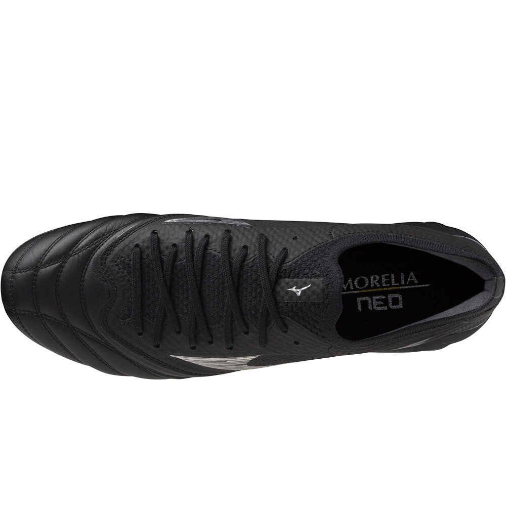 - Las botas fútbol Mizuno MORELIA NEO IV BETA ELITE MD Negro Gris, están confeccionadas en piel canguro premium ultraligera con un patrón de cosido para un toque de lujo y una superior sensación de contacto con el balón. El cuello en tejido KNIT NEO combinado con paneles MESH NEO laterales de punto β proporcionan un increíble cierre y ajuste. Aportan una mejorada flexibilidad y durabilidad con los beneficios de peso ligero gracias a la suela graduada de Pebax y el contrafuerte estabilizador exterior para el talón.