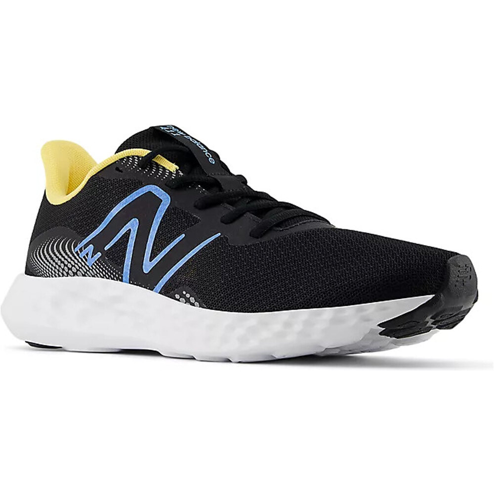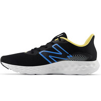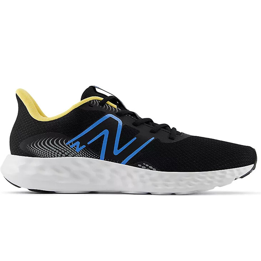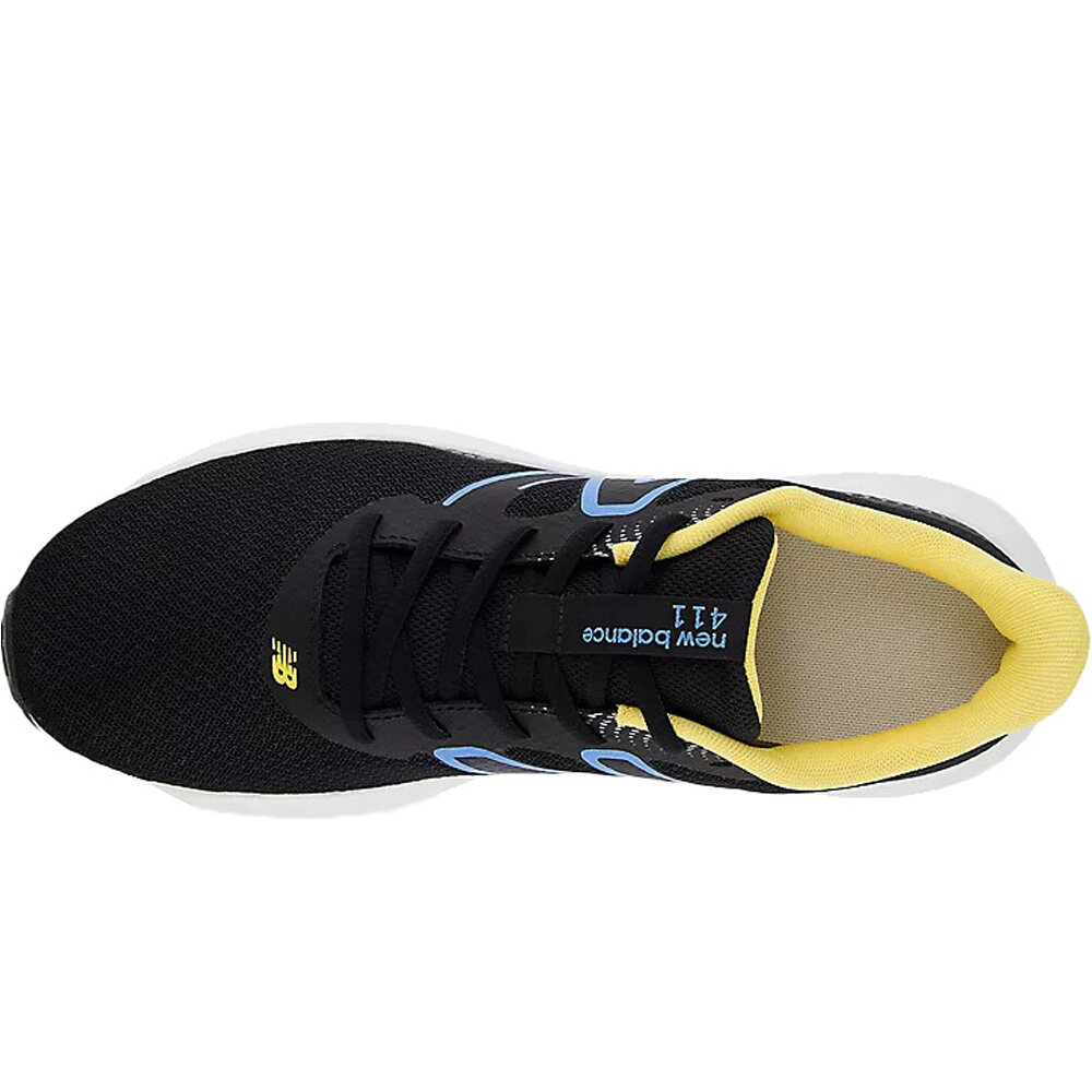 - La horma de estas zapatillas running New Balance 411 v3 Negro Azul Amarillo está confeccionada malla ligera y revestimiento en el talón sintético de protección.