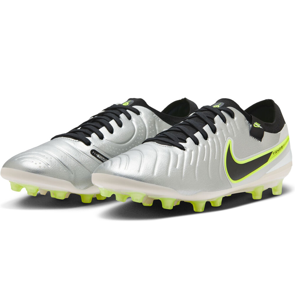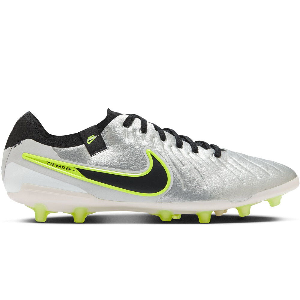 - La horma de las botas Nike TIEMPO LEGEND 10 PRO AG Plata Amarillo Volt Negro está confeccionada en piel natural FlyTouch Pro y relieve acolchado en el empeine, para ofrecer un excepcional disparo y control del balón. Permite un toque preciso, así como una adherencia natural con el balón. El suave forro de microfibra textil envuelve el tobillo al tiempo que la lengüeta se estira para que puedas ponerte las botas fácilmente.