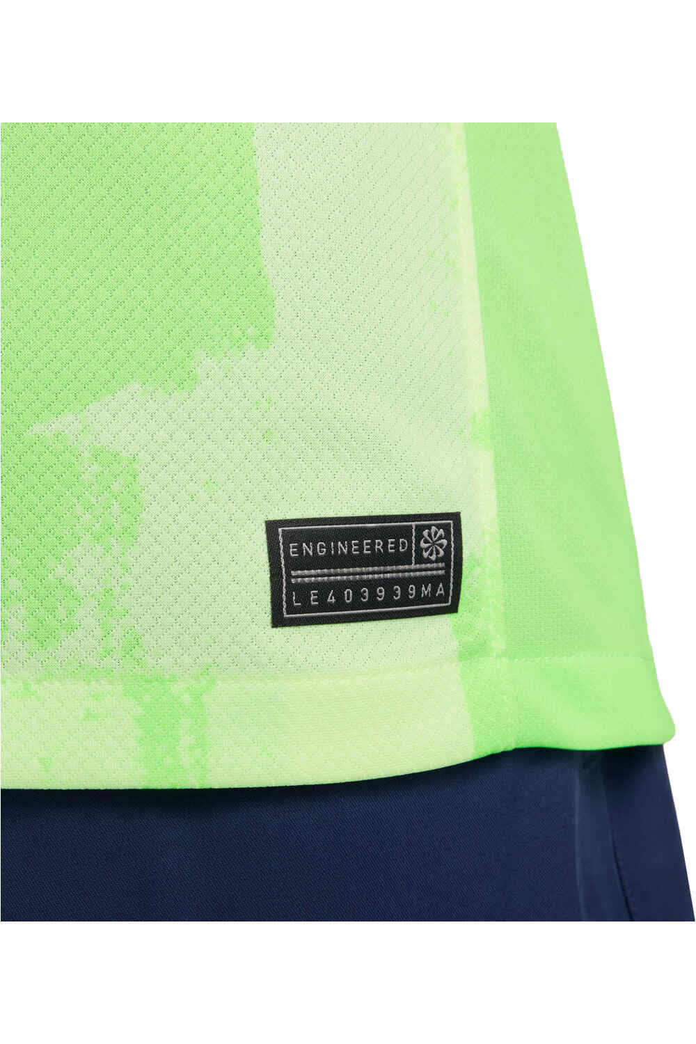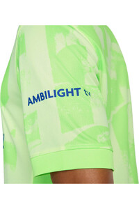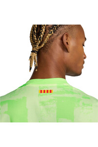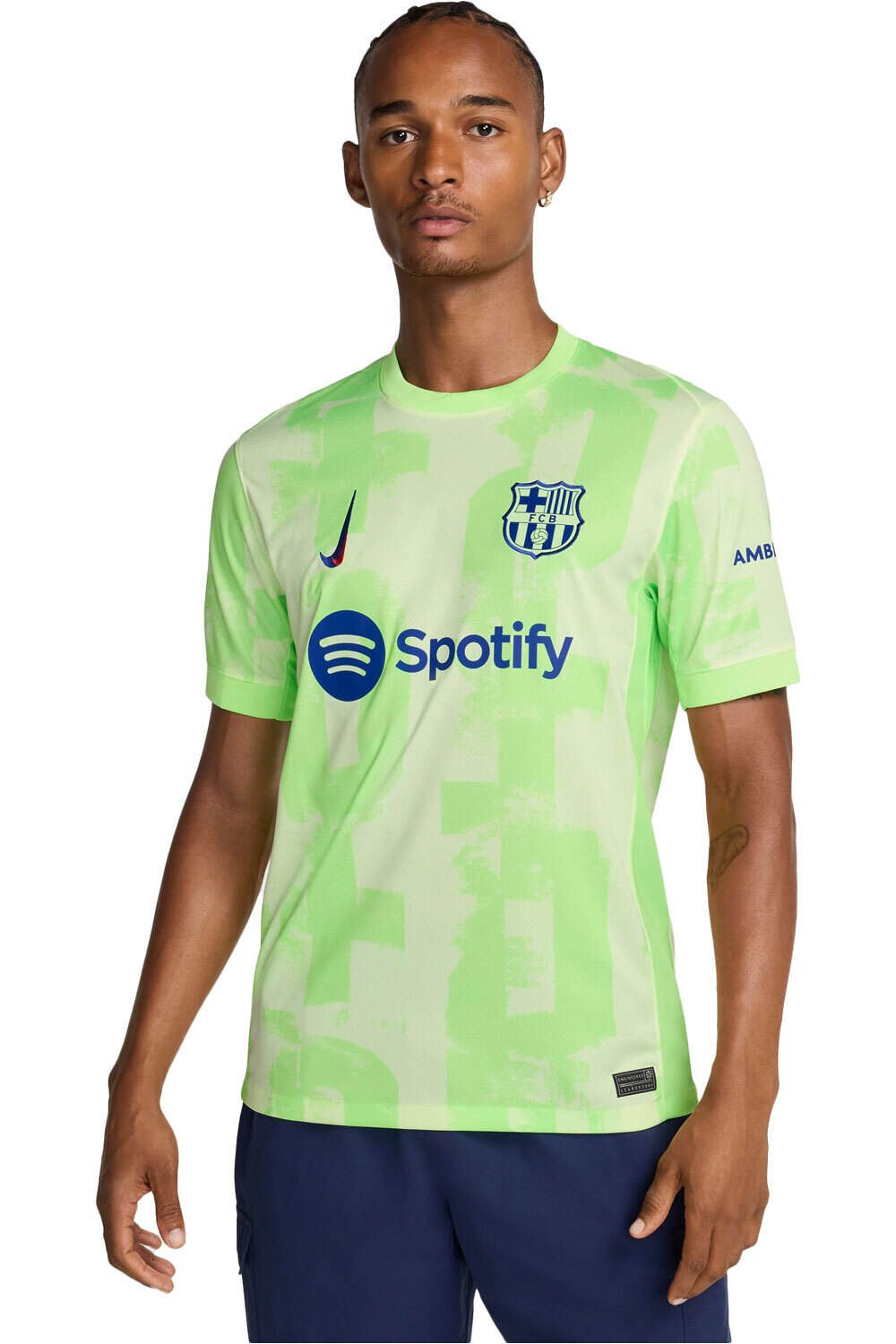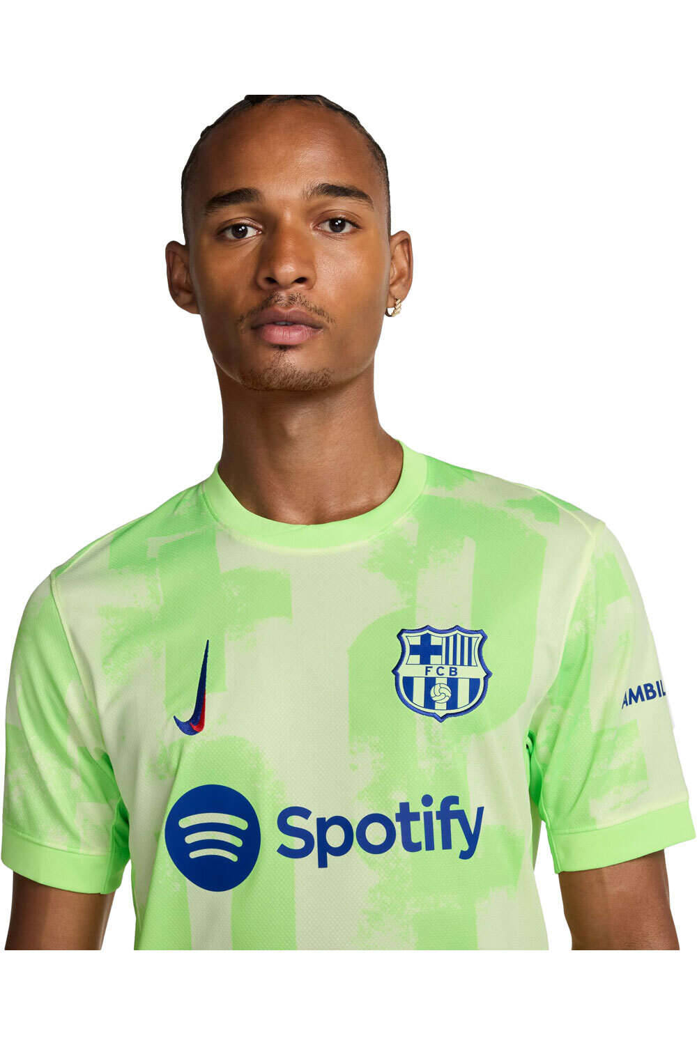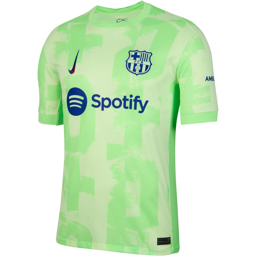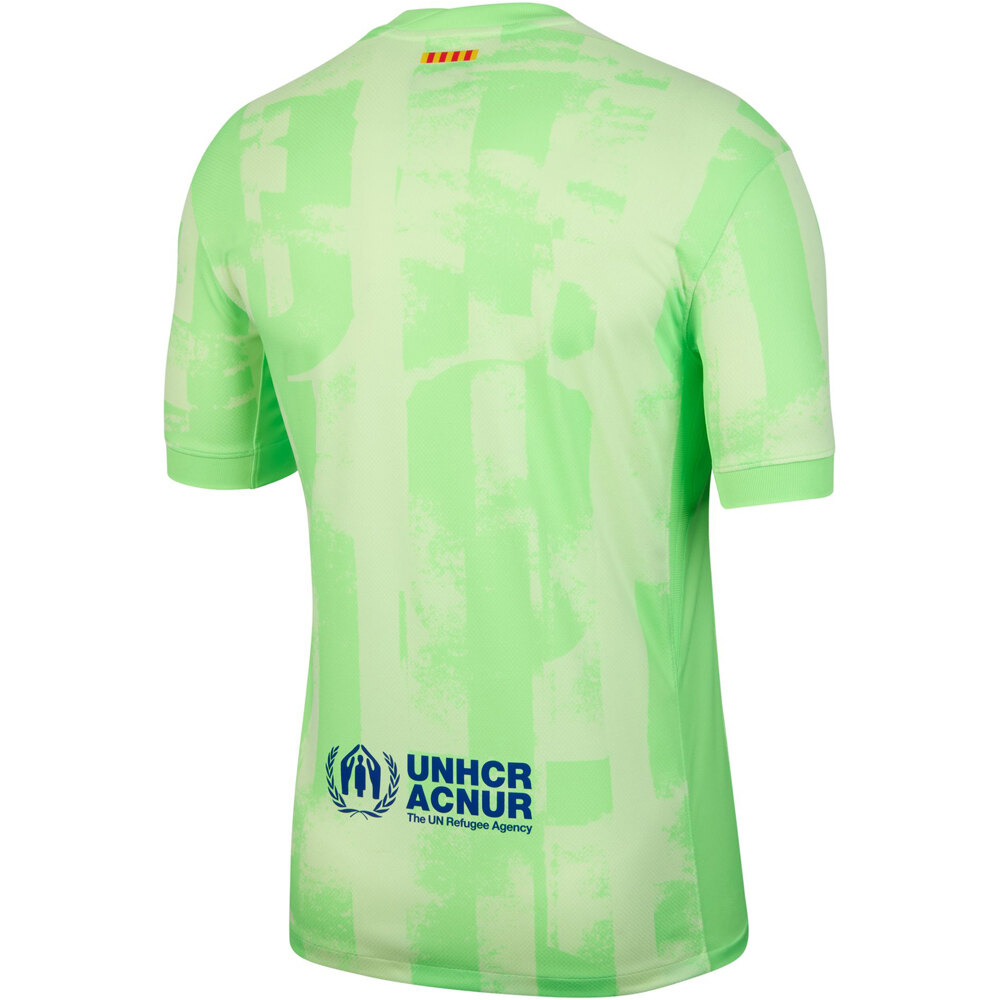 - Camiseta fútbol oficial Nike FC BARCELONA 2024/25 tercera equipación. Esta es la camiseta que llevan los equipos masculino y femenino del FC Barcelona para los partidos que jueguen fuera de casa. El diseño en color lima y los motivos subliminados de fondo, hacen homenaje a las atletas, artistas y movimientos culturales que han dejado huella en el club y su ciudad. La bandera catalana, la inscripción 125 en el interior del cuello o el escudo en su centro, marcan los detalles de personalidad y estilo de esta prenda única. Vibrante y de líneas innovadoras creada para lucirla con orgullo, tanto si juegas y entrenas con ella, como si la llevas al estadio para apoyar desde la grada.