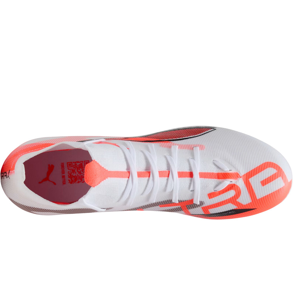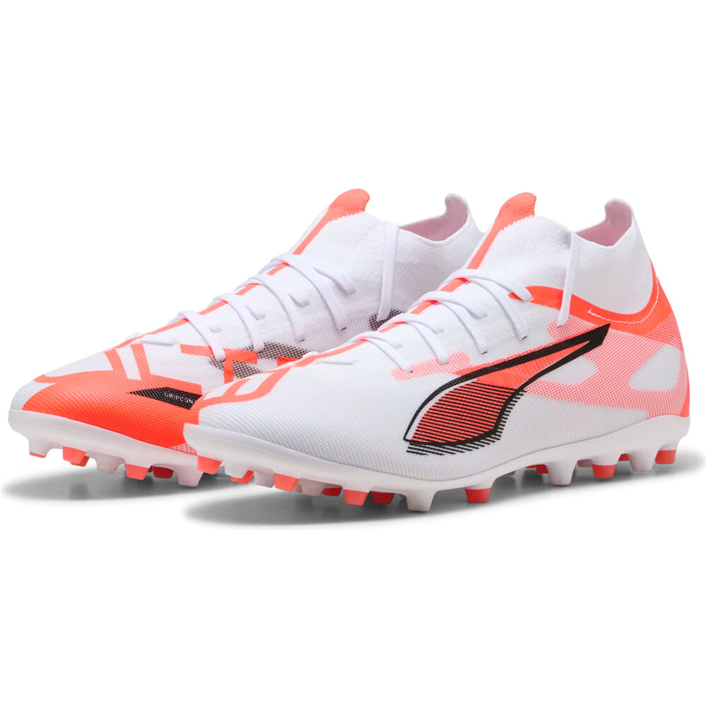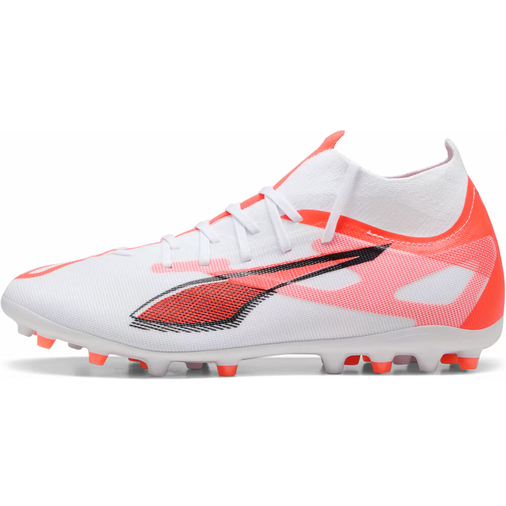 - La parte superior de las botas de fútbol Puma ULTRA 5 MATCH+ MG Blanco Naranja Negro está confeccionada con un exterior sintético de compresión suave y perfecta adaptación al pie. La malla y revestimiento GripControl de Puma ofrecen un mayor agarre y grip de balón cuando estás en modo ataque. Diseño de caña media con collar del talón envolvente y zona de cordones fusionados en tejido de punto Knit, para un ajuste ceñido y suave. Empeine fabricado con al menos un 30 % de materiales reciclados.