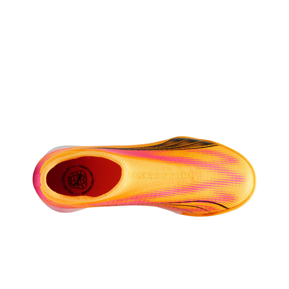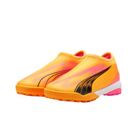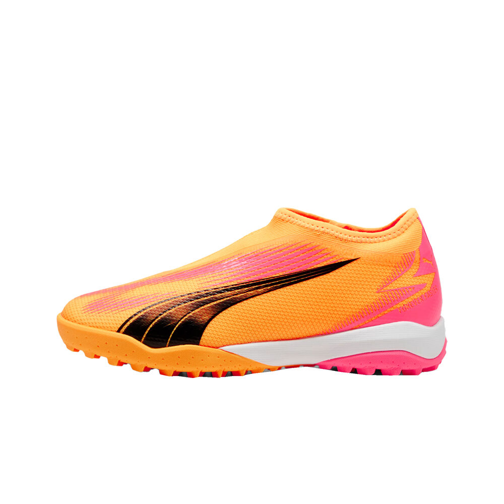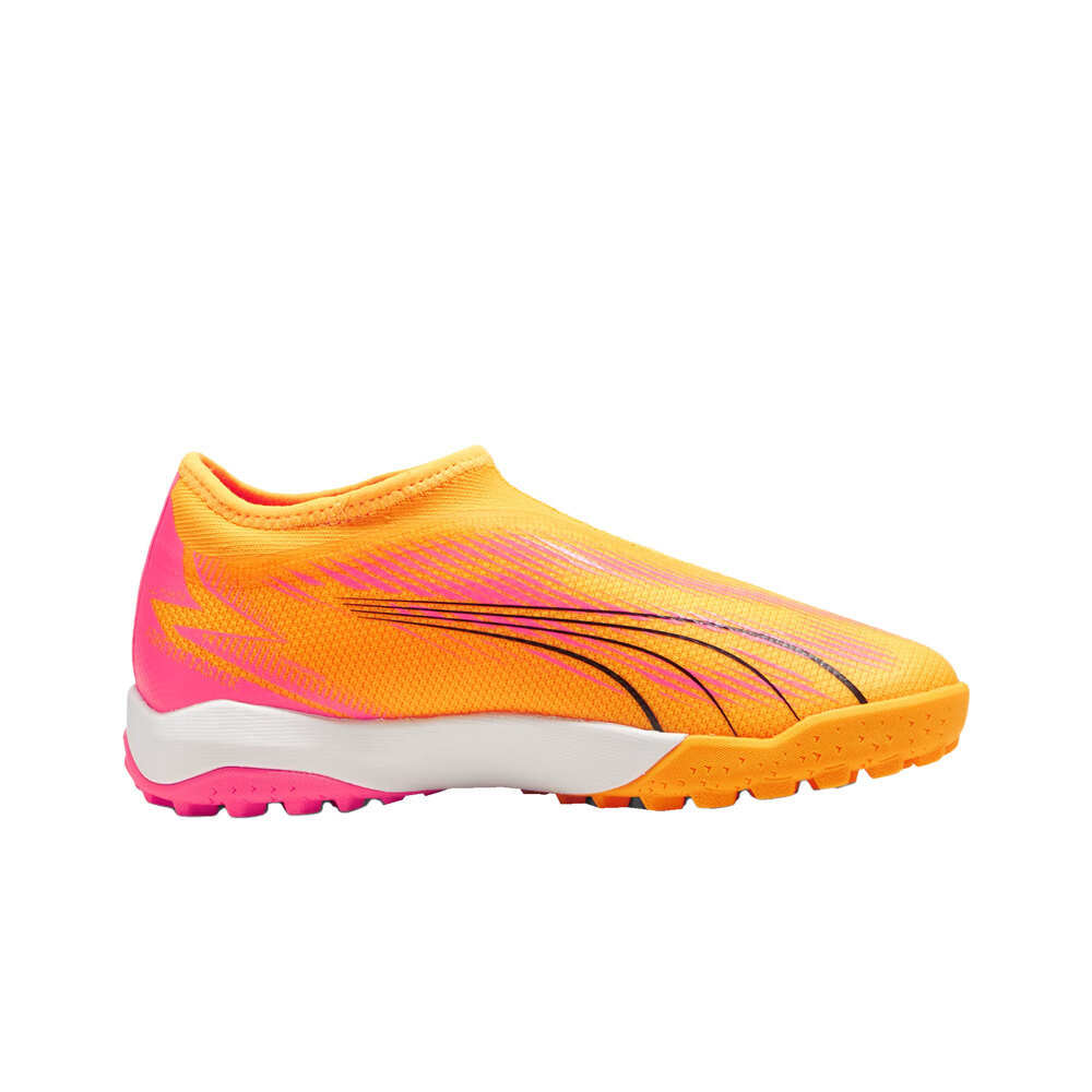 - Las botas de fútbol infantil Puma ULTRA MATCH LL TT + Mid JR Rosa Negro Blanco presentan un perfil sin cordones, con una cubierta sintética y textil muy ligera para una mayor velocidad de movimientos. Revestimiento GripControl Speedcage para un control y golpeo de balón mejorado cuando estás atacando. Integración del collar del talón y la zona de los cordones, con tejido elástico de ajuste compresivo, flexible y suave.
