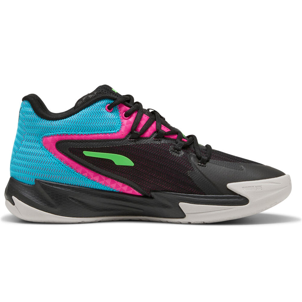 - Esta zapatilla baloncesto Puma Dagger Negro Rosa Azul Verde está construida con una cubierta de malla texturizada transpirable y refuerzos termo moldeados de revestimiento que ofrece una adaptación cómoda al movimiento del pie y mayor resistencia durante el juego. El diseño envolvente permite un ajuste perfecto, favoreciendo la agilidad y la rapidez en el juego. Además, se completa con el sistema dinámico de cordones con puntos de anclaje en el empeine y en el antepié, para una mayor seguridad.
