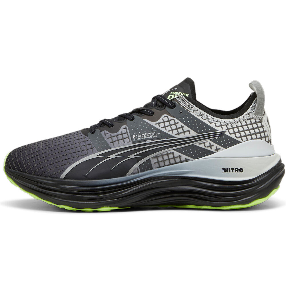- La parte superior de las zapatillas running Puma ForeverRun NITRO Water Repelent Negro Gris está fabricada en malla técnica repelente al agua y material resistente, de ajuste confortable y envolvente. Cuenta con tiras PWRPLATE, inserciones impresas de refuerzo exterior y sujeción. El contrafuerte del talón ayuda a mantener el pie en su lugar. Logo con elementos de diseño reflectantes.