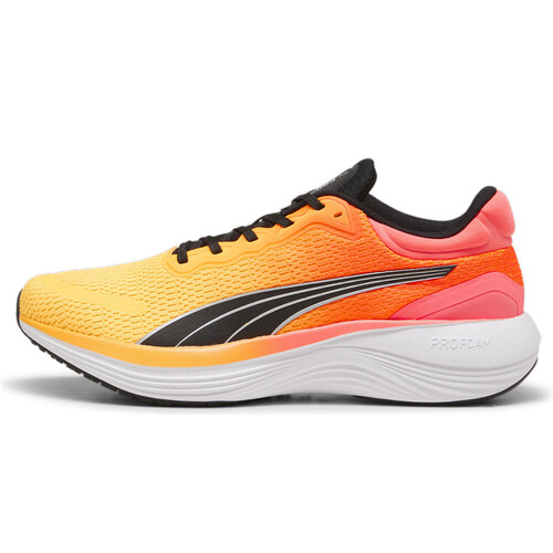 - Estas zapatillas running Puma Scend Pro Negro Naranja Coral llevan una parte superior en tejido y malla traspirable y ligera. El perfil dinámico con inserciones impresas y talón acolchado mejoran su ajuste y el confort, nada más ponértelas.