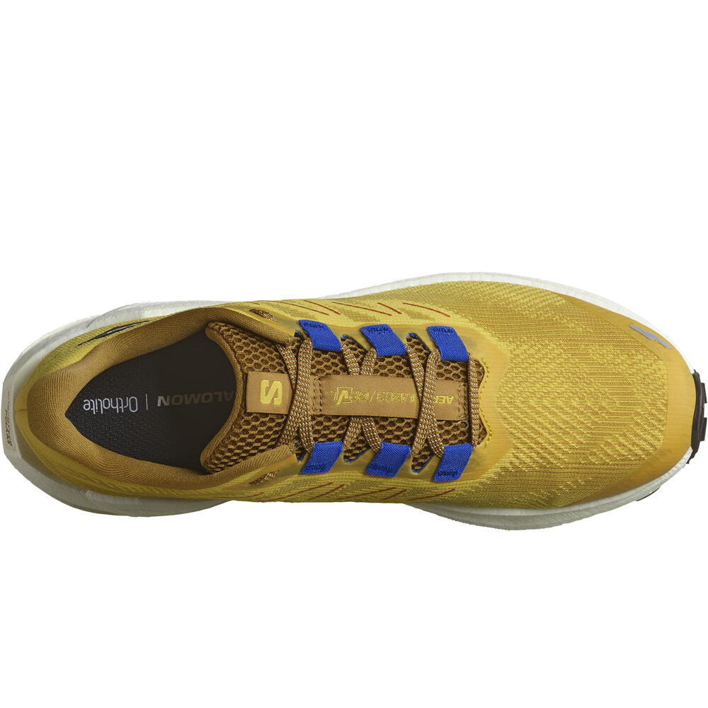 - Las zapatillas running Salomon AERO BLAZE 3 GRVL Amarillo Mostaza llevan una parte superior con cubierta de tejido Engineered Mesh ventilado de perfecta sujeción y flexibilidad. El diseño SensiFit™ envuelve el pie para ganar en confianza, mientras la puntera protectora añade mayor soporte. Lengüeta mullida y con rejilla transpirable, asegura el mejor confort. Realizada con materiales procedentes de productos reciclados.