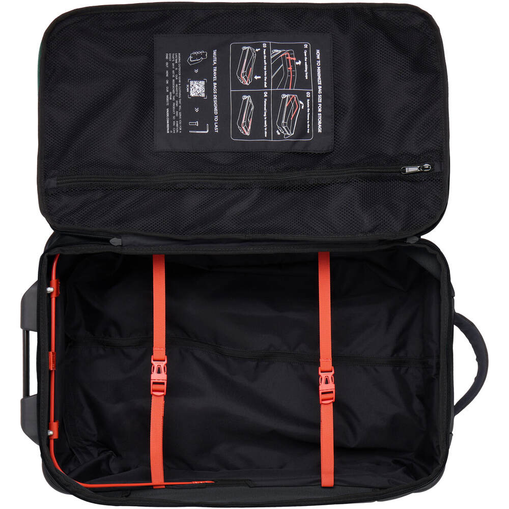 - La maleta Takutea 35 incluye ruedas de goma silenciosas, mango telescópico extensible y asas acolchadas en los laterales corto y largo. Su interior está equipado con correas de embalaje, un fondo intermedio de malla con cremallera y compartimentos adicionales. Adema, tiene franjas reflectantes frontales, para ser visto en condiciones de poca luz. Certificada con los sellos Green Shape y Grüner Knopf.